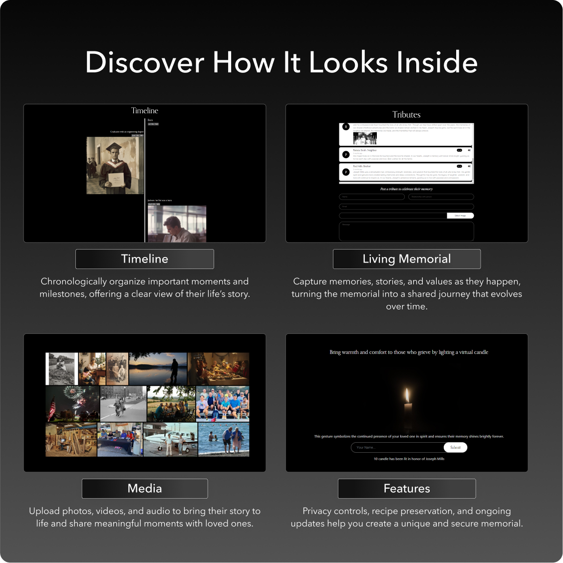 - Unlimited storage space to craft your tribute (Biography, Photos & Videos, Stories, and more!)